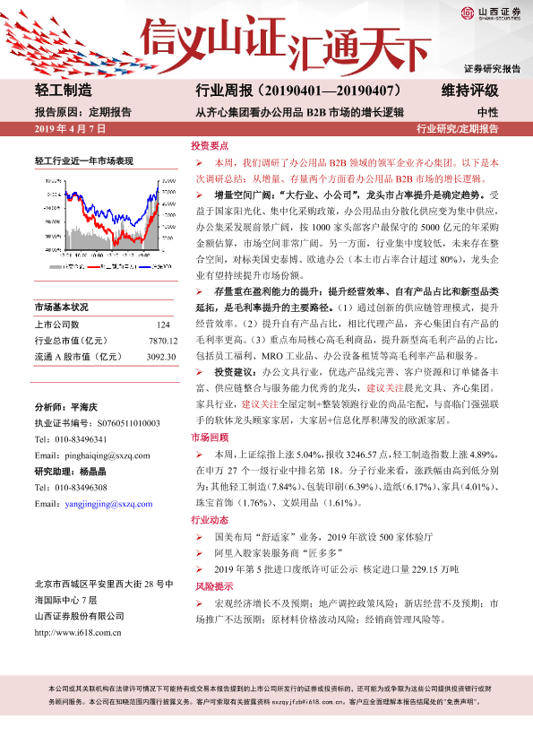 【山西证券】【20190407】20190407-山西证券-轻工制造行业周报:从齐心集团看办公用品B2B市场的增长逻辑-15页