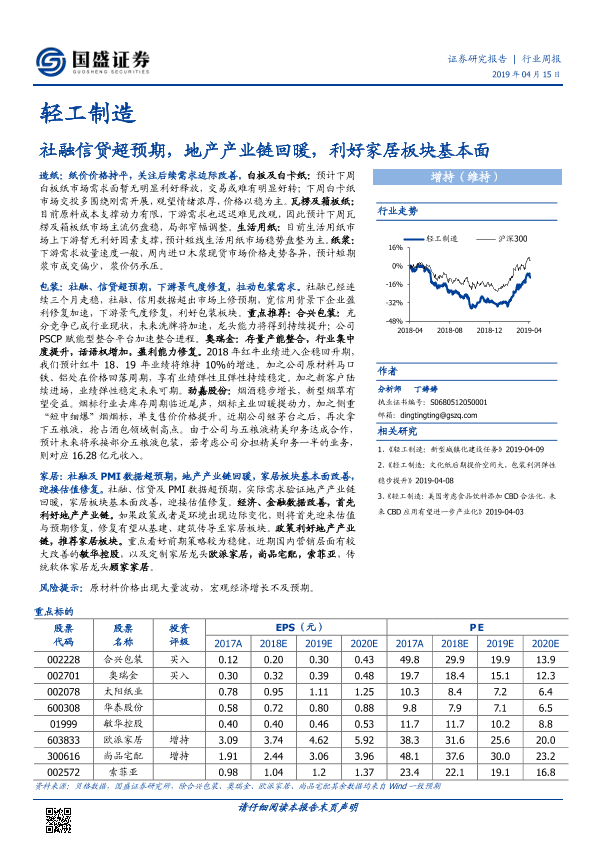 【国盛证券】【20190415】20190415-国盛证券-轻工制造行业周报:社融信贷超预期,地产产业链回暖,利好家居板块基本面-10页