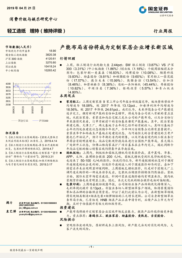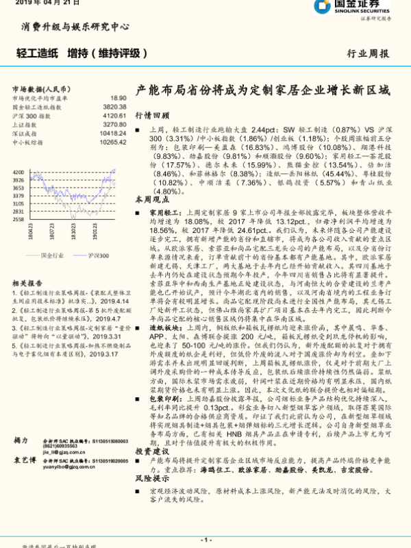 【国金证券】【20190421】轻工造纸行业周报:产能布局省份将成为定制家居企业增长新区域-27页