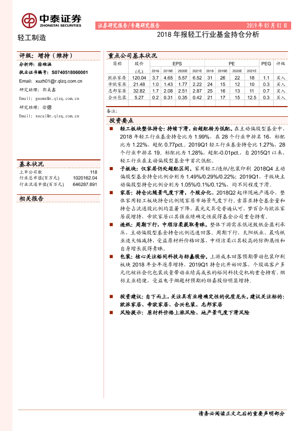 【中泰证券】【20190501】2018年报轻工行业基金持仓分析-10页