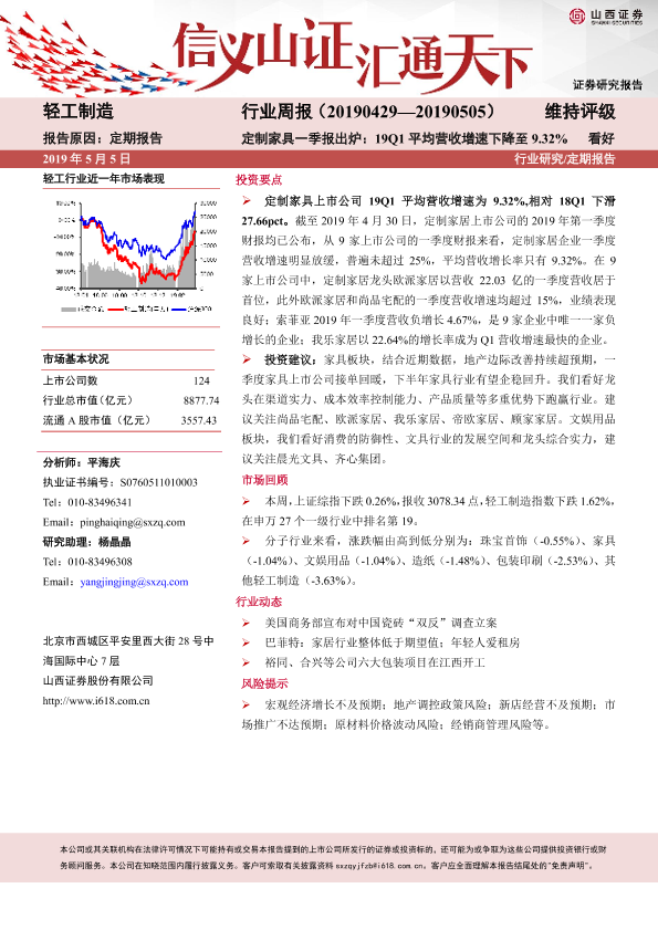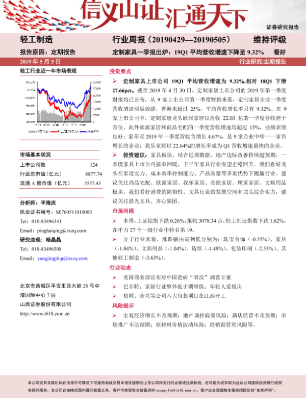【山西证券】【20190505】20190505-山西证券-轻工制造行业周报:定制家具一季报出炉:19Q1平均营收增速下降至9.32%-12页