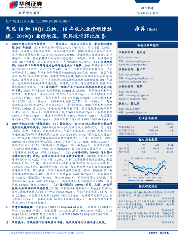 【华创证券】【20190505】20190505-华创证券-轻工制造行业周报:聚焦18和19Q1总结,18年收入业绩增速放缓,2019Q1业绩承压,家具珠宝环比改善-22页