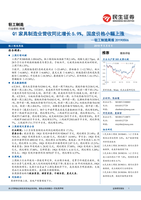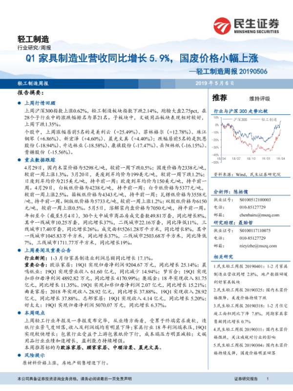 【民生证券】【20190506】Q1家具制造业营收同比增长5.9%,国废价格小幅上涨——轻工制造周报 20190506-18页