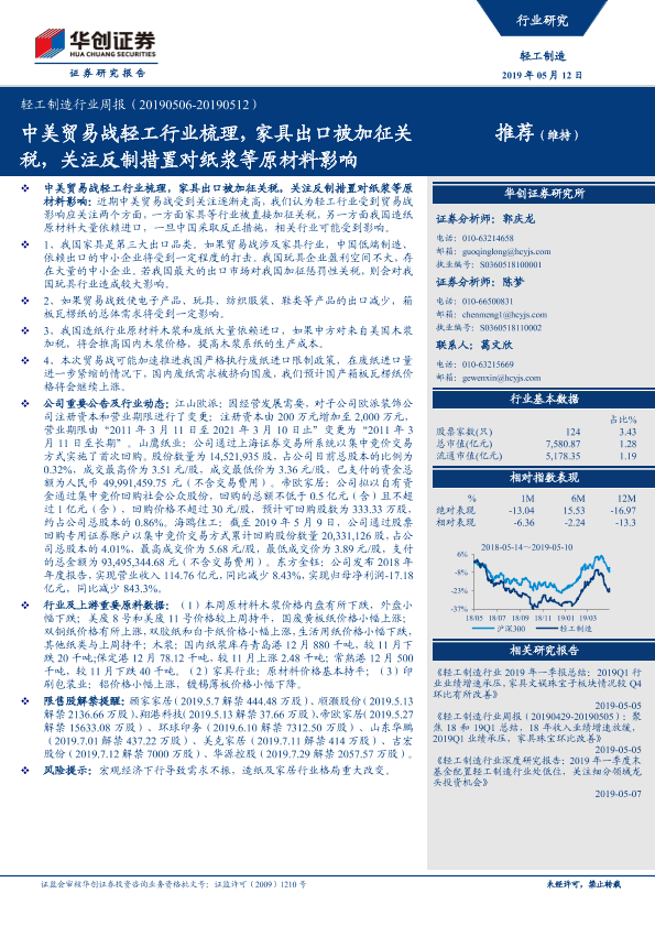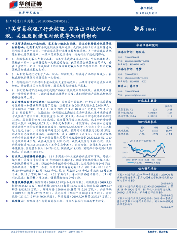 【华创证券】【20190512】20190512-华创证券-轻工制造行业周报:中美贸易战轻工行业梳理,家具出口被加征关税,关注反制措置对纸浆等原材料影响-16页