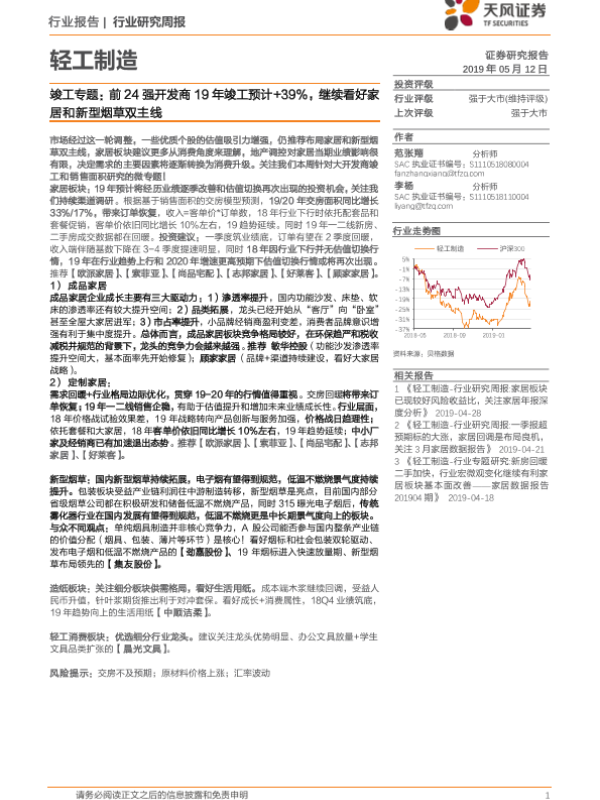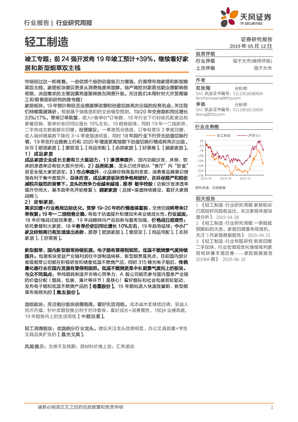 【天风证券】【20190512】20190512-天风证券-轻工制造行业研究周报:竣工专题:前24强开发商19年竣工预计+39%,继续看好家居和新型烟草双主线-21页
