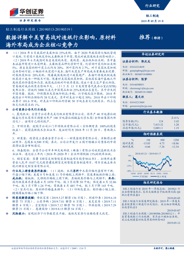 【华创证券】【20190519】轻工制造行业周报:数据详解中美贸易战对造纸行业影响,原材料海外布局成为企业核心竞争力-17页