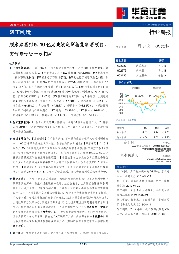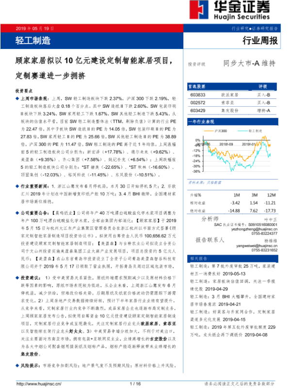 【华金证券】【20190519】20190519-华金证券-轻工制造行业周报:顾家家居拟以10亿元建设定制智能家居项目,定制赛道进一步拥挤-16页