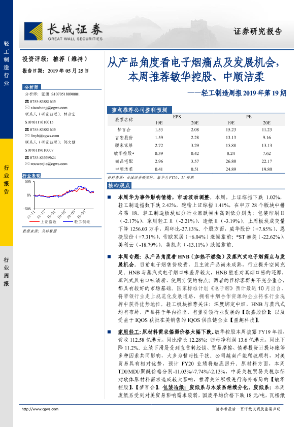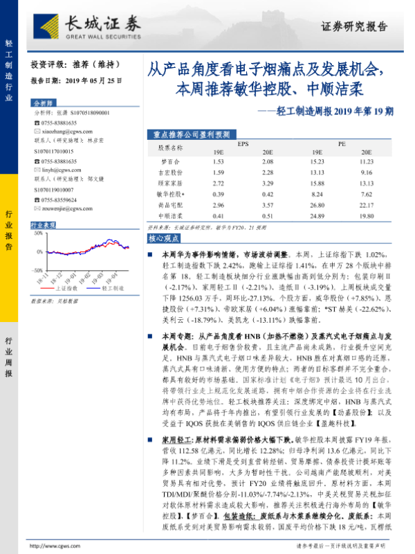 【长城证券】【20190525】轻工制造周报2019年第19期:从产品角度看电子烟痛点及发展机会,本周推荐敏华控股、中顺洁柔-29页