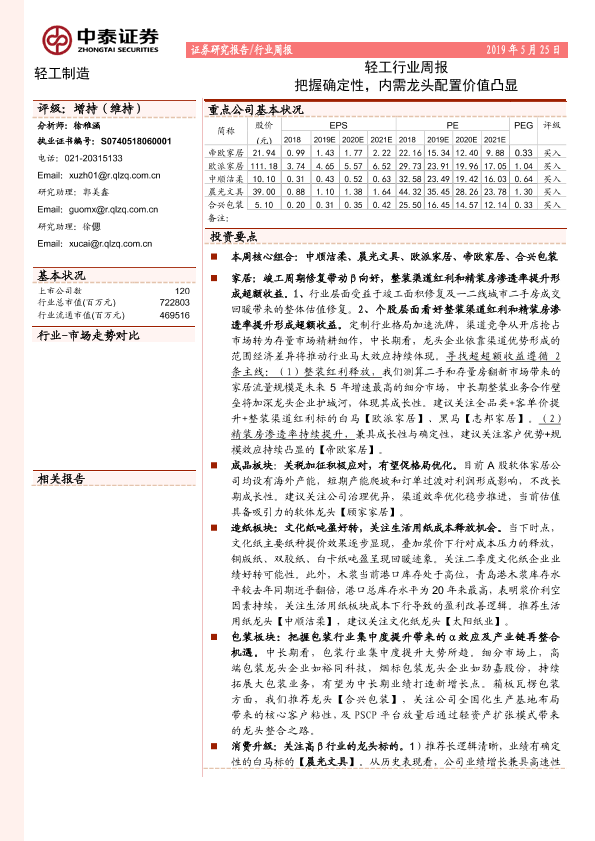 【中泰证券】【20190525】20190525-中泰证券-轻工行业周报:把握确定性,内需龙头配置价值凸显-15页