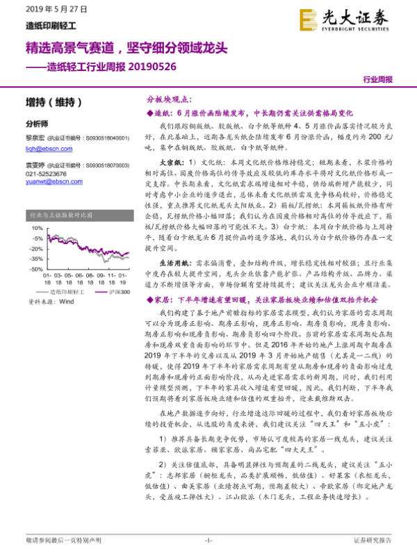 【光大证券】【20190527】20190527-光大证券-造纸轻工行业周报:精选高景气赛道,坚守细分领域龙头-21页