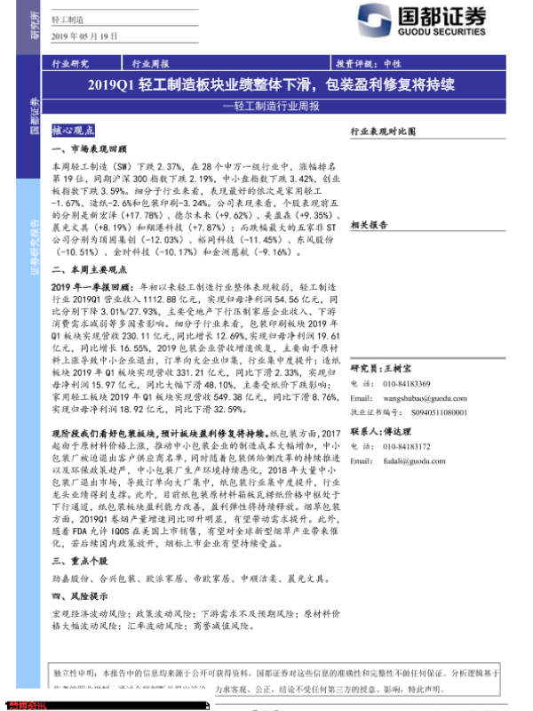 【国都证券】【20190519】2019Q1轻工制造板块业绩整体下滑,包装盈利修复将持续-2页