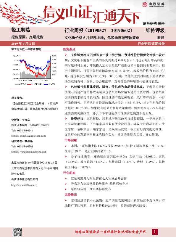 【山西证券】【20190602】20190602-山西证券-轻工制造行业周报:文化纸价格5月迎来上涨,包装纸市场整体疲弱-11页