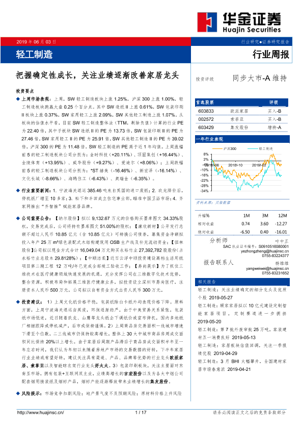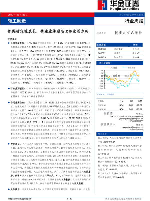 【华金证券】【20190603】20190603-华金证券-轻工制造行业周报:把握确定性成长,关注业绩逐渐改善家居龙头-17页
