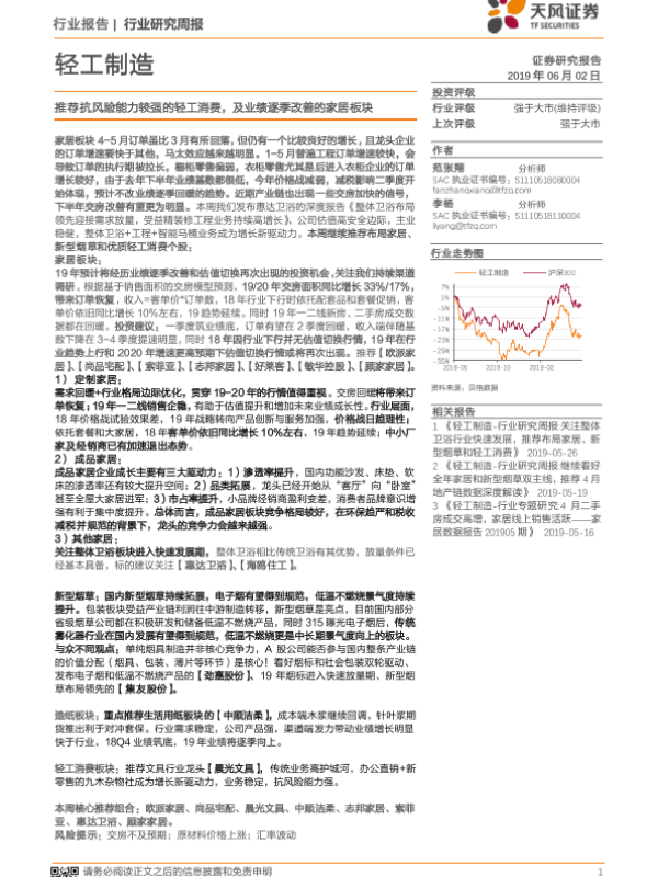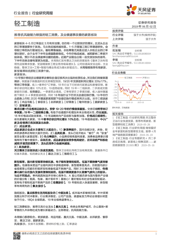 【天风证券】【20190602】20190602-天风证券-轻工制造行业研究周报:推荐抗风险能力较强的轻工消费,及业绩逐季改善的家居板块-19页