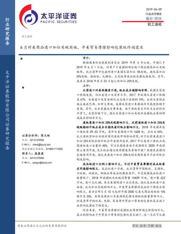 【太平洋证券】【20190609】6月对美商品进口加征关税实施,中美贸易摩擦影响包装纸终端需求-4页