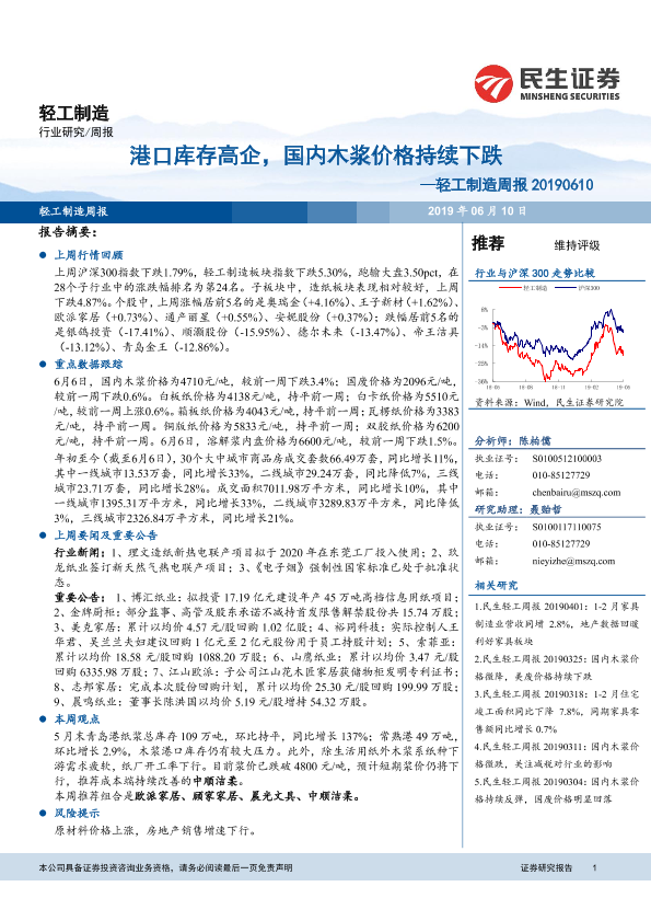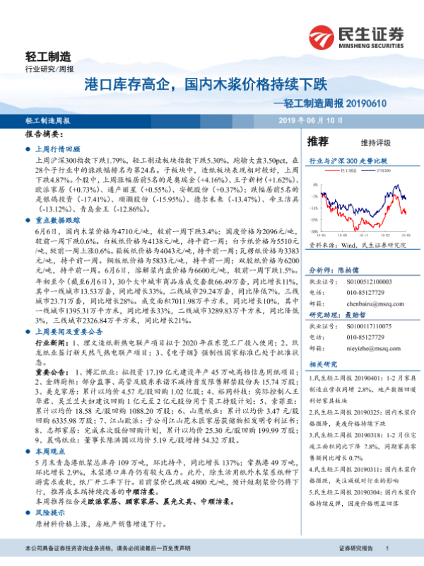 【民生证券】【20190610】轻工制造周报:港口库存高企,国内木浆价格持续下跌-16页