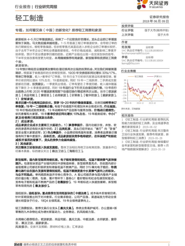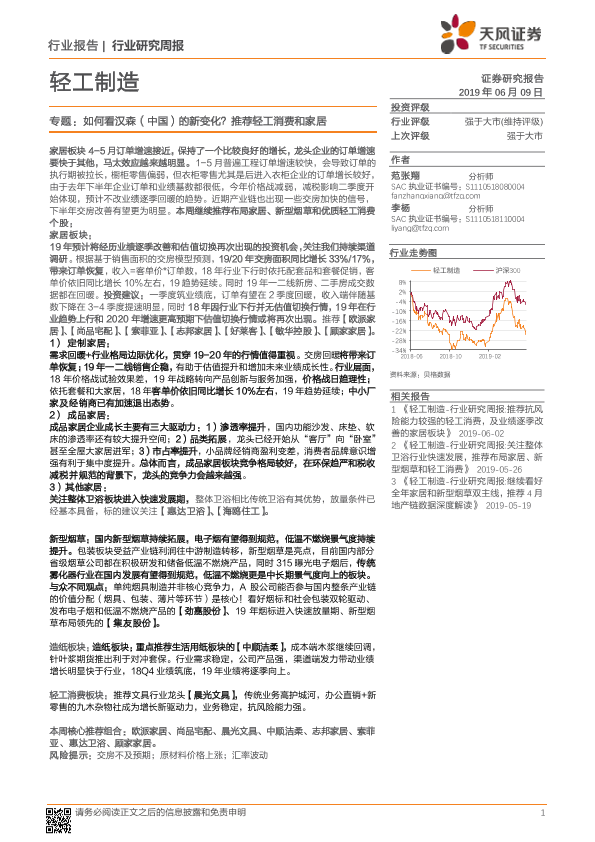 【天风证券】【20190609】20190609-天风证券-轻工制造行业研究周报:如何看汉森(中国)的新变化?推荐轻工消费和家居-20页
