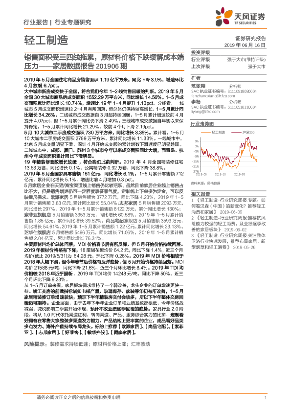 【天风证券】【20190616】轻工制造行业家居数据报告201906期:销售面积受三四线拖累,原材料价格下跌缓解成本端压力-16页