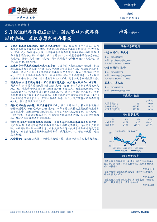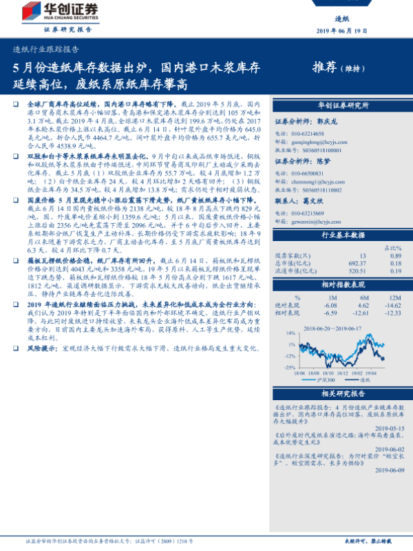 【华创证券】【20190619】20190619-华创证券-造纸行业跟踪报告:5月份造纸库存数据出炉,国内港口木浆库存延续高位,废纸系原纸库存攀高-10页