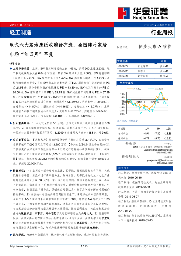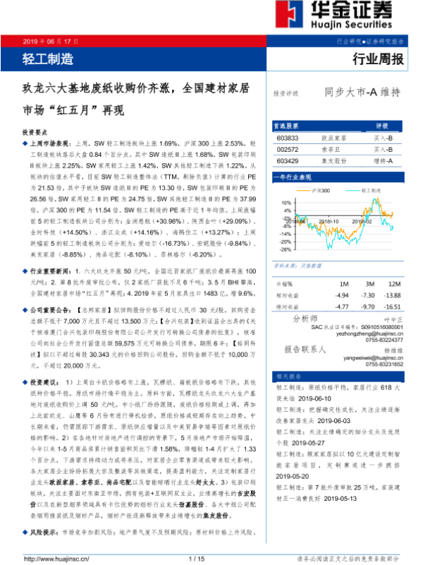【华金证券】【20190617】20190617-华金证券-轻工制造行业周报:玖龙六大基地废纸收购价齐涨,全国建材家居市场“红五月”再现-15页
