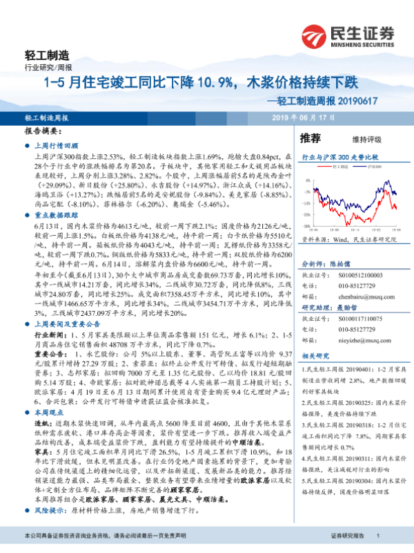 【民生证券】【20190617】20190617-民生证券-轻工制造周报:1-5月住宅竣工同比下降10.9%,木浆价格持续下跌-16页