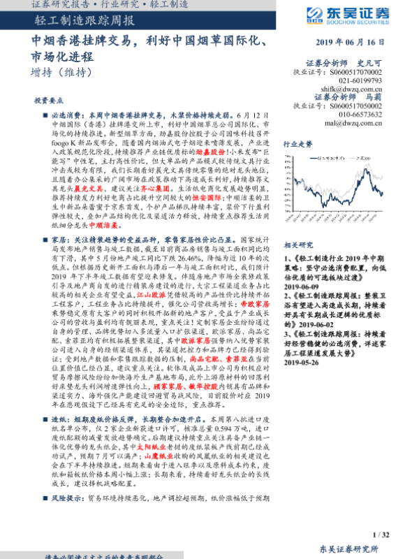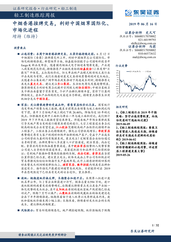 【东吴证券】【20190616】20190616-东吴证券-轻工制造跟踪周报:中烟香港挂牌交易,利好中国烟草国际化、市场化进程-32页