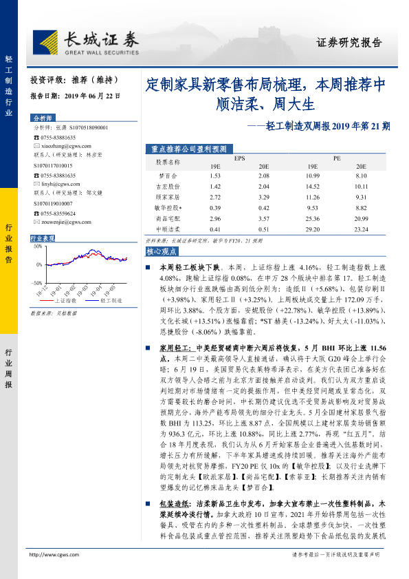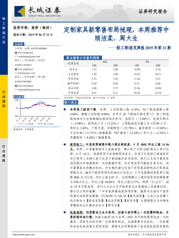 【长城证券】【20190622】20190622-长城证券-轻工制造双周报2019年第21期:定制家具新零售布局梳理,本周推荐中顺洁柔、周大生-32页