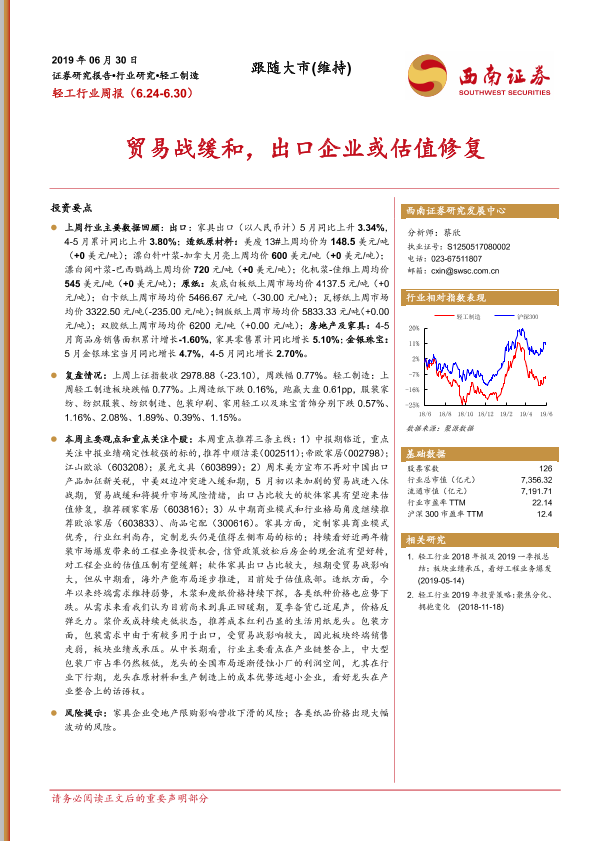 【西南证券】【20190630】20190630-西南证券-轻工行业周报:贸易战缓和,出口企业或估值修复-10页