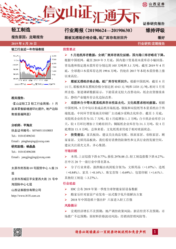 【山西证券】【20190630】轻工制造行业周报:箱板瓦楞纸价格企稳,纸厂库存有所回升-13页
