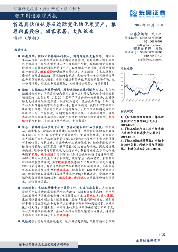 【东吴证券】【20190630】轻工制造跟踪周报:首选具估值优势及边际变化的优质资产,推荐劲嘉股份、顾家家居、太阳纸业-32页