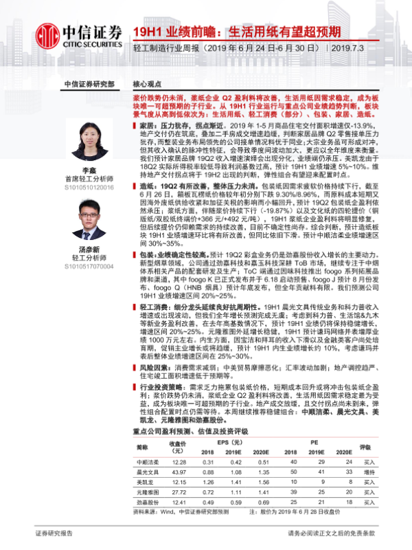 【中信证券】【20190703】20190703-中信证券-轻工制造行业周报:19H1业绩前瞻:生活用纸有望超预期-15页