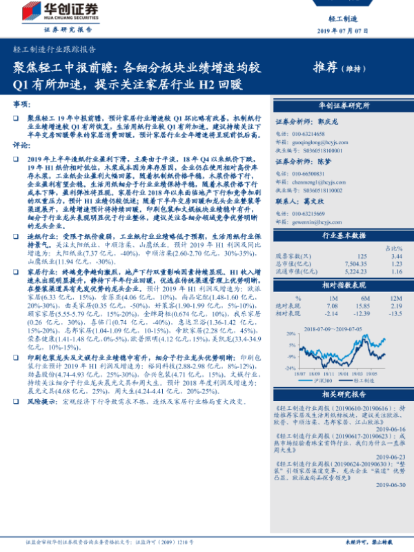 【华创证券】【20190707】轻工制造行业跟踪报告:聚焦轻工中报前瞻:各细分板块业绩增速均较Q1有所加速,提示关注家居行业H2回暖-5页