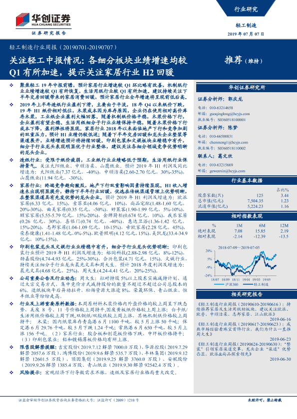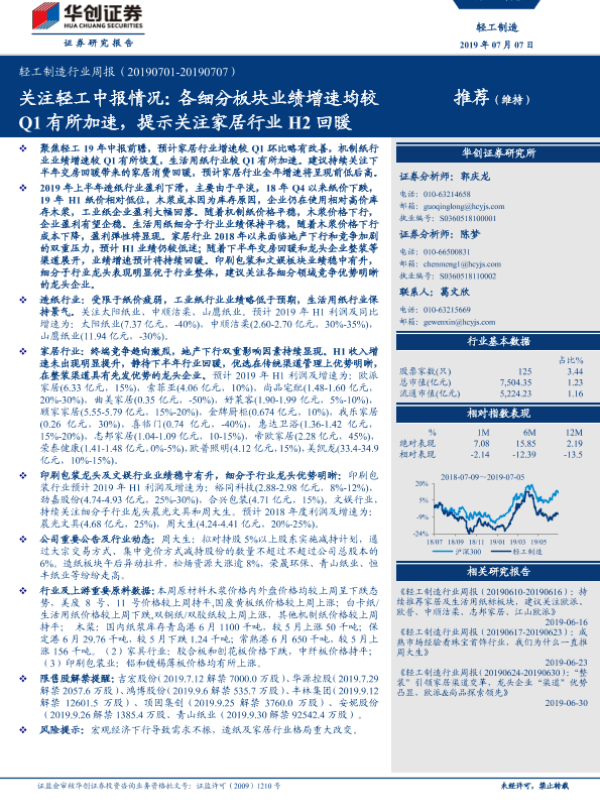 【华创证券】【20190707】轻工制造行业周报:关注轻工中报情况:各细分板块业绩增速均较Q1有所加速,提示关注家居行业H2回暖-14页