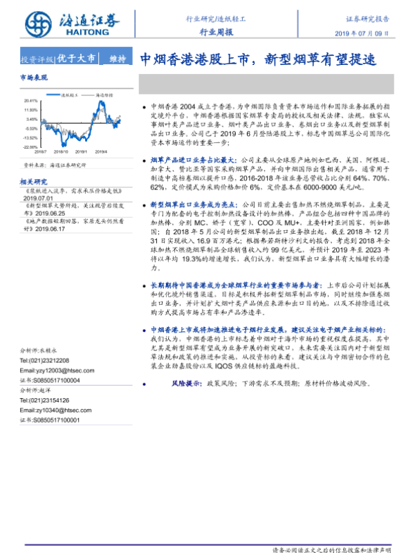 新型烟草 港股上市 行业周报 造纸轻工 中烟香港