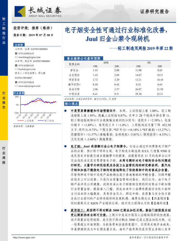 【长城证券】【20190708】轻工制造双周报2019年第22期:电子烟安全性可通过行业标准化改善,Juul旧金山禁令现转机-33页
