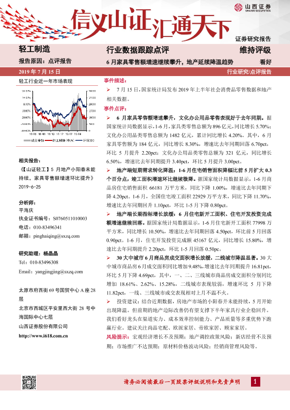 【山西证券】【20190715】20190715-山西证券-轻工制造行业数据跟踪点评:6月家具零售额增速继续攀升,地产延续降温趋势-4页