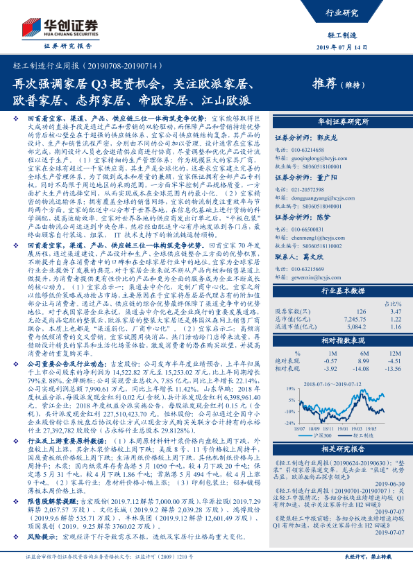 【华创证券】【20190714】轻工制造行业周报:再次强调家居Q3投资机会,关注欧派家居、欧普家居、志邦家居、帝欧家居、江山欧派-12页