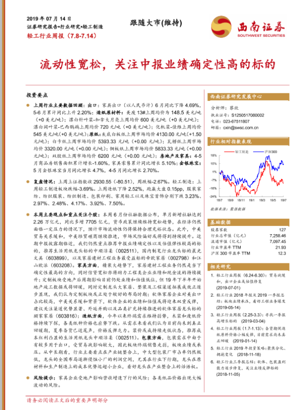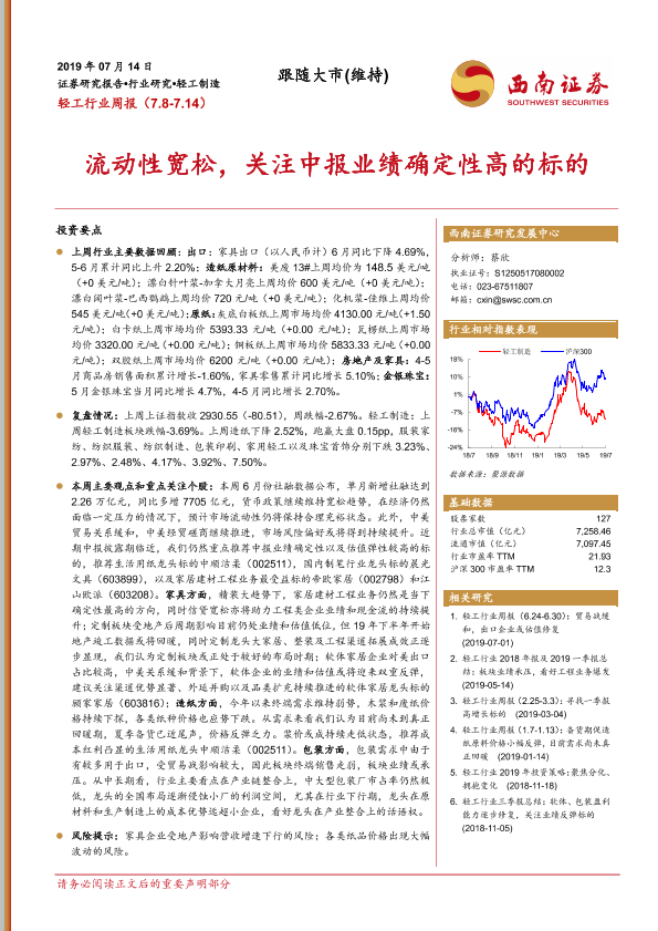 【西南证券】【20190714】20190714-西南证券-轻工行业周报:流动性宽松,关注中报业绩确定性高的标的-10页