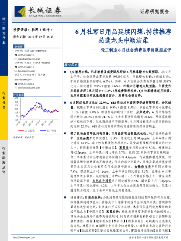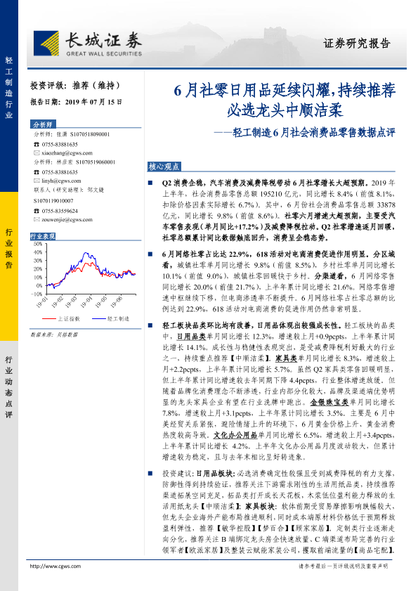 【长城证券】【20190715】20190715-长城证券-轻工制造6月社会消费品零售数据点评:6月社零日用品延续闪耀,持续推荐必选龙头中顺洁柔-5页