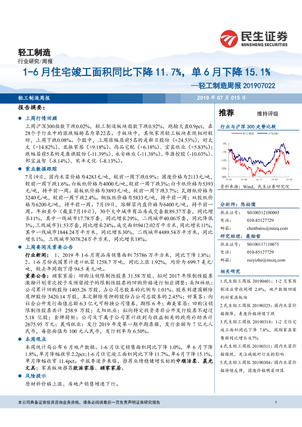 【民生证券】【20190715】20190715-民生证券-轻工制造周报:1-6月住宅竣工面积同比下降11.7%,单6月下降15.1%-17页