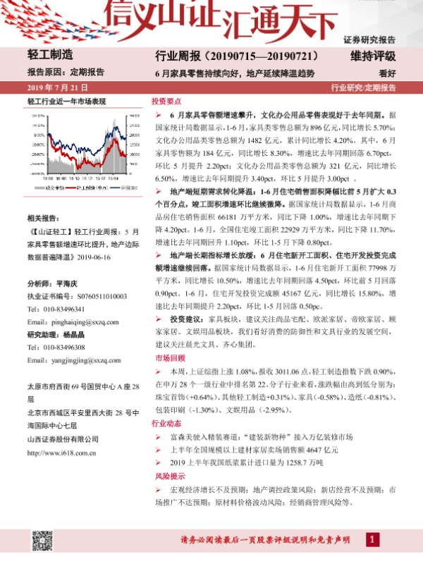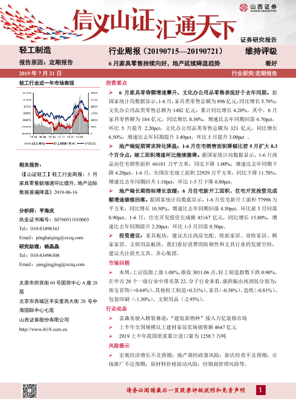 【山西证券】【20190721】20190721-山西证券-轻工制造行业周报:6月家具零售持续向好,地产延续降温趋势-16页
