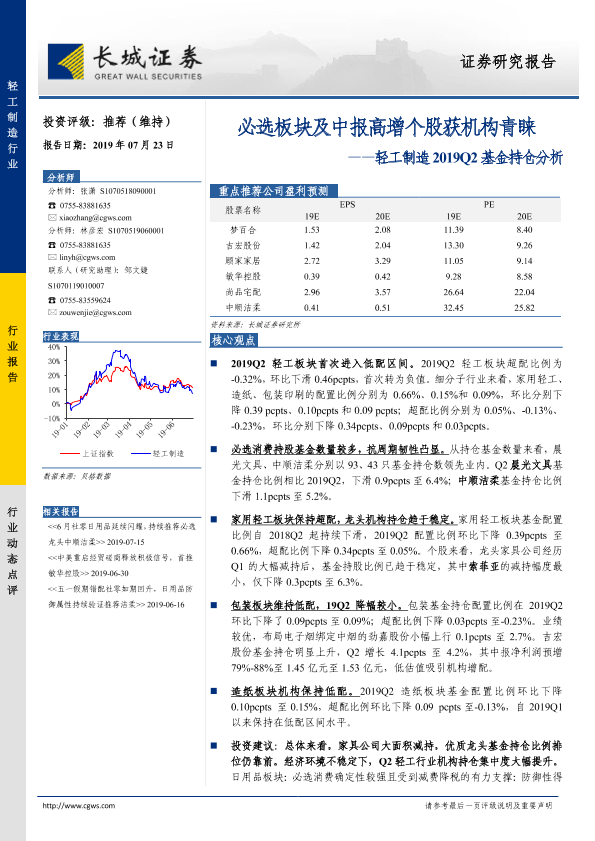 【长城证券】【20190723】轻工制造2019Q2基金持仓分析:必选板块及中报高增个股获机构青睐-9页