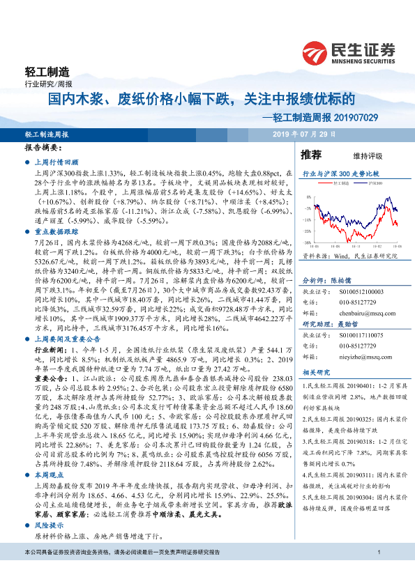 【民生证券】【20190729】20190729-民生证券-轻工制造周报:国内木浆、废纸价格小幅下跌,关注中报绩优标的-16页