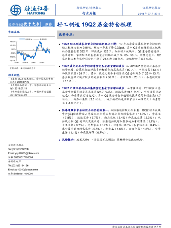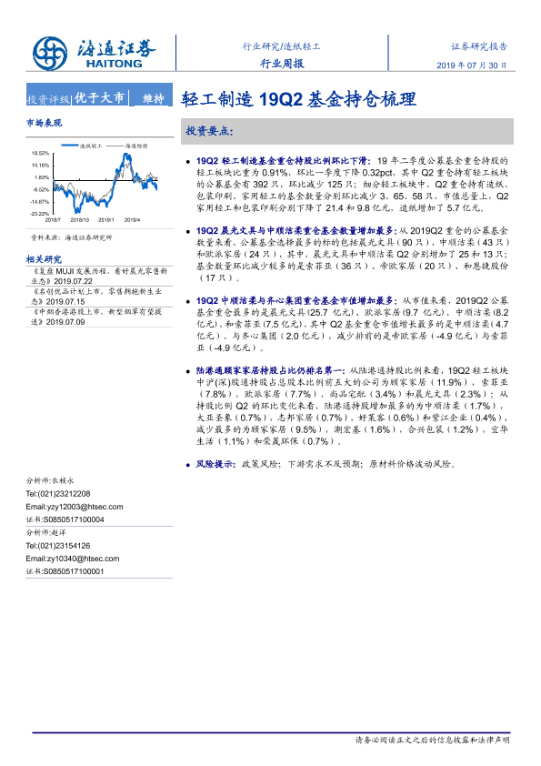 【海通证券】【20190730】20190730-海通证券-造纸轻工行业周报:轻工制造19Q2基金持仓梳理-9页