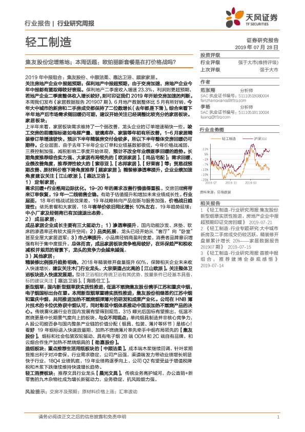 【天风证券】【20190728】20190728-天风证券-轻工制造行业研究周报:集友股份定增落地;本周话题:欧铂丽新套餐是在打价格战吗?-21页