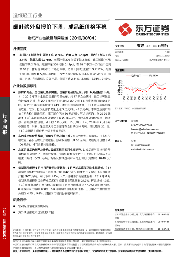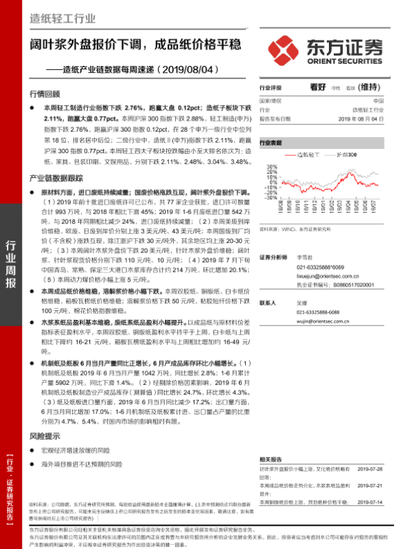 【东方证券】【20190804】20190804-东方证券-造纸产业链数据每周速递:阔叶浆外盘报价下调,成品纸价格平稳-14页
