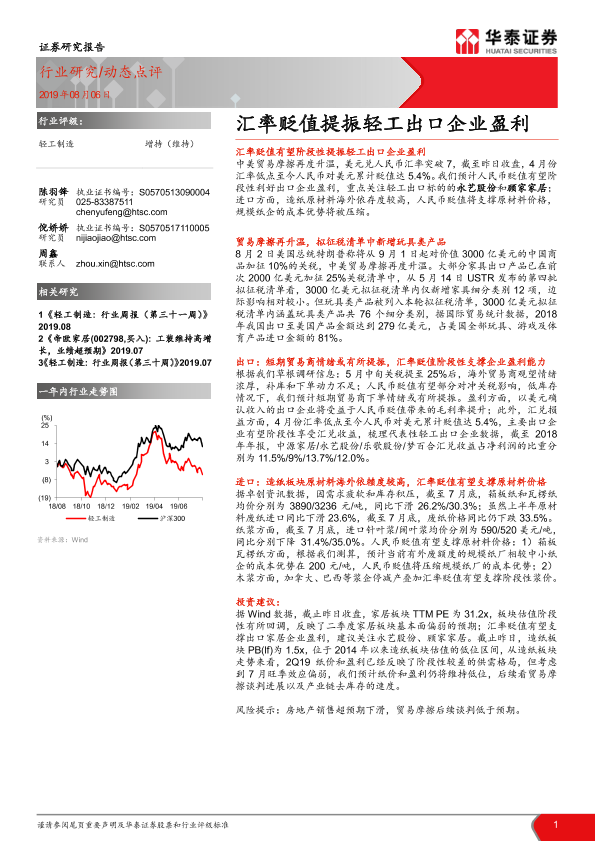 【华泰证券】【20190806】轻工制造行业动态点评:汇率贬值提振轻工出口企业盈利-2页