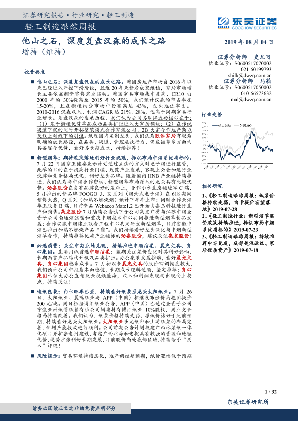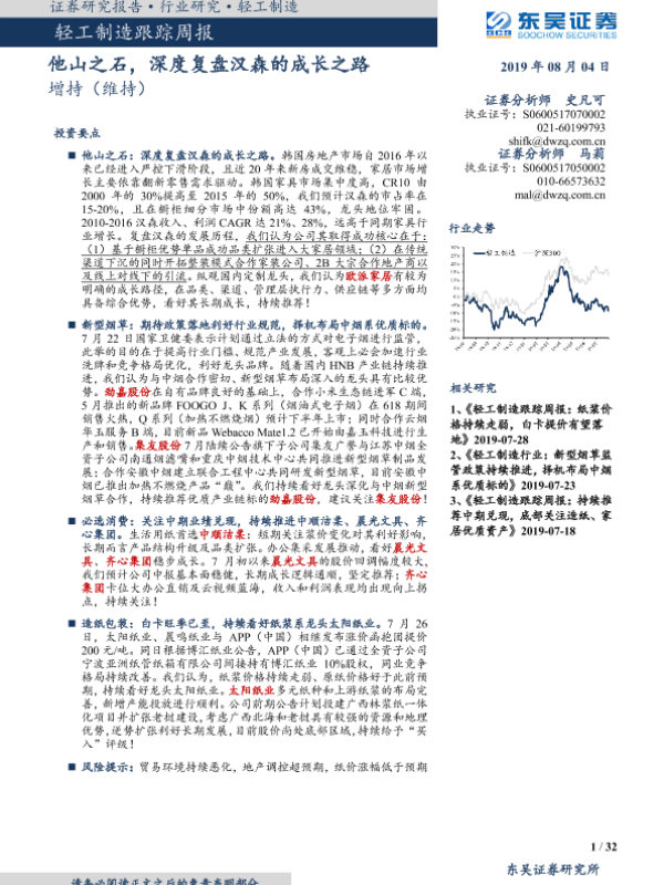 【东吴证券】【20190804】轻工制造跟踪周报:他山之石,深度复盘汉森的成长之路-32页