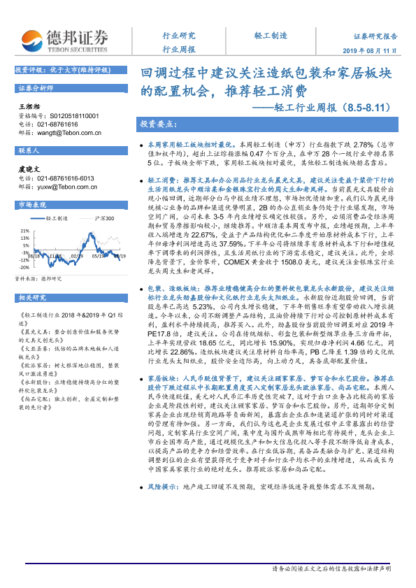 【德邦证券】【20190811】20190811-德邦证券-轻工行业周报:回调过程中建议关注造纸包装和家居板块的配置机会,推荐轻工消费-5页