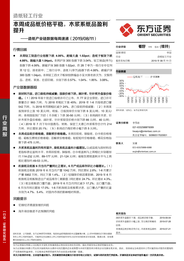 【东方证券】【20190811】造纸产业链数据每周速递:本周成品纸价格平稳,木浆系纸品盈利提升-14页